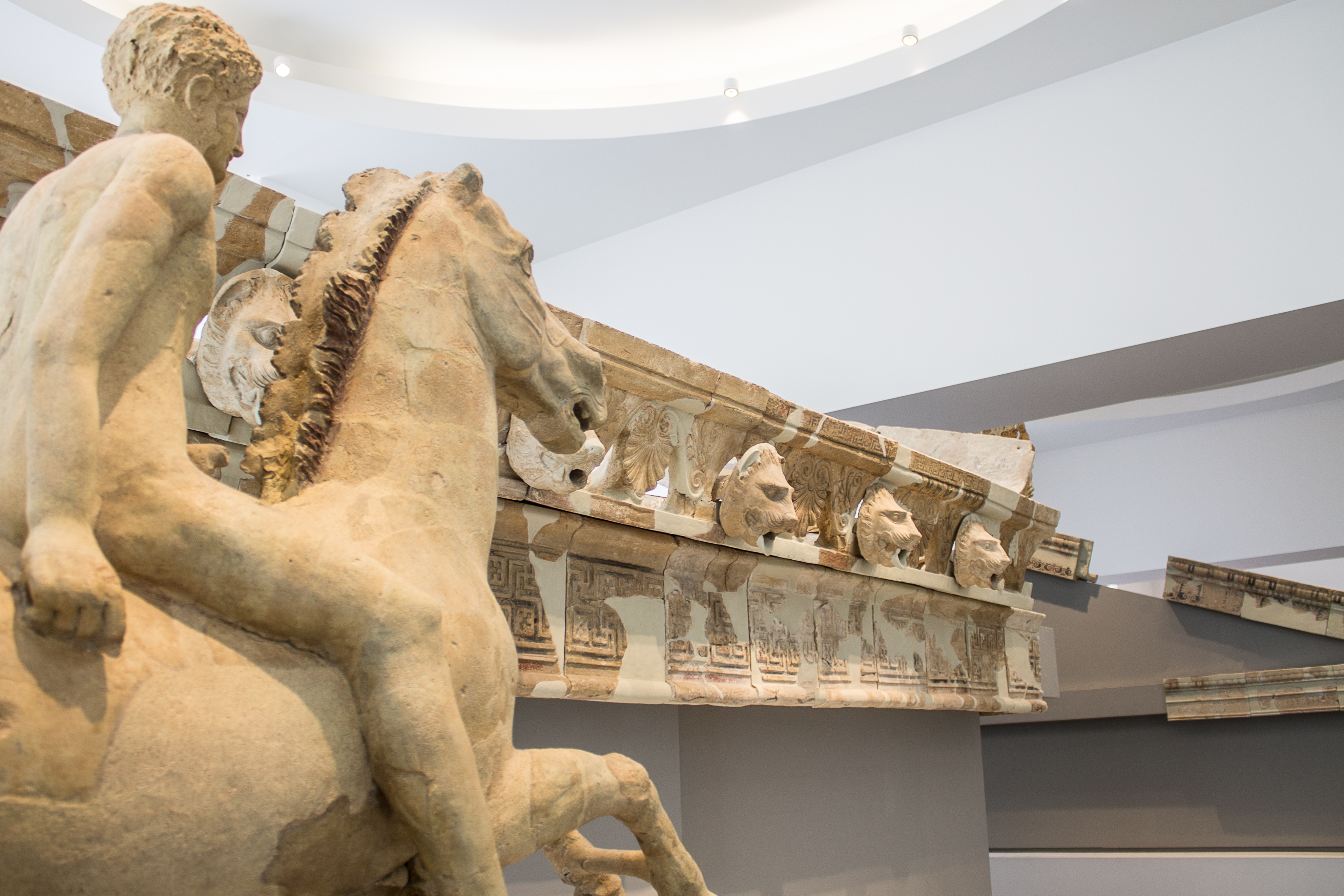 Eccezionali le anastilosi dei templi di Lokroi Epizephyrioi: i decori in terracotta recuperano lo splendore del 425 a. C. sotto i nostri occhi, posti ad un’altezza adatta al godimento di ogni suo modulo, curva e pigmentazione. Ho apprezzato la gestione degli spazi in ogni sala, ma qui devo ho avvertito una sensazione di claustrofobia, credo che monumenti tanto grandi abbiano la necessità di uno spazio più scenografico in cui possano troneggiarne spioventi e sculture.