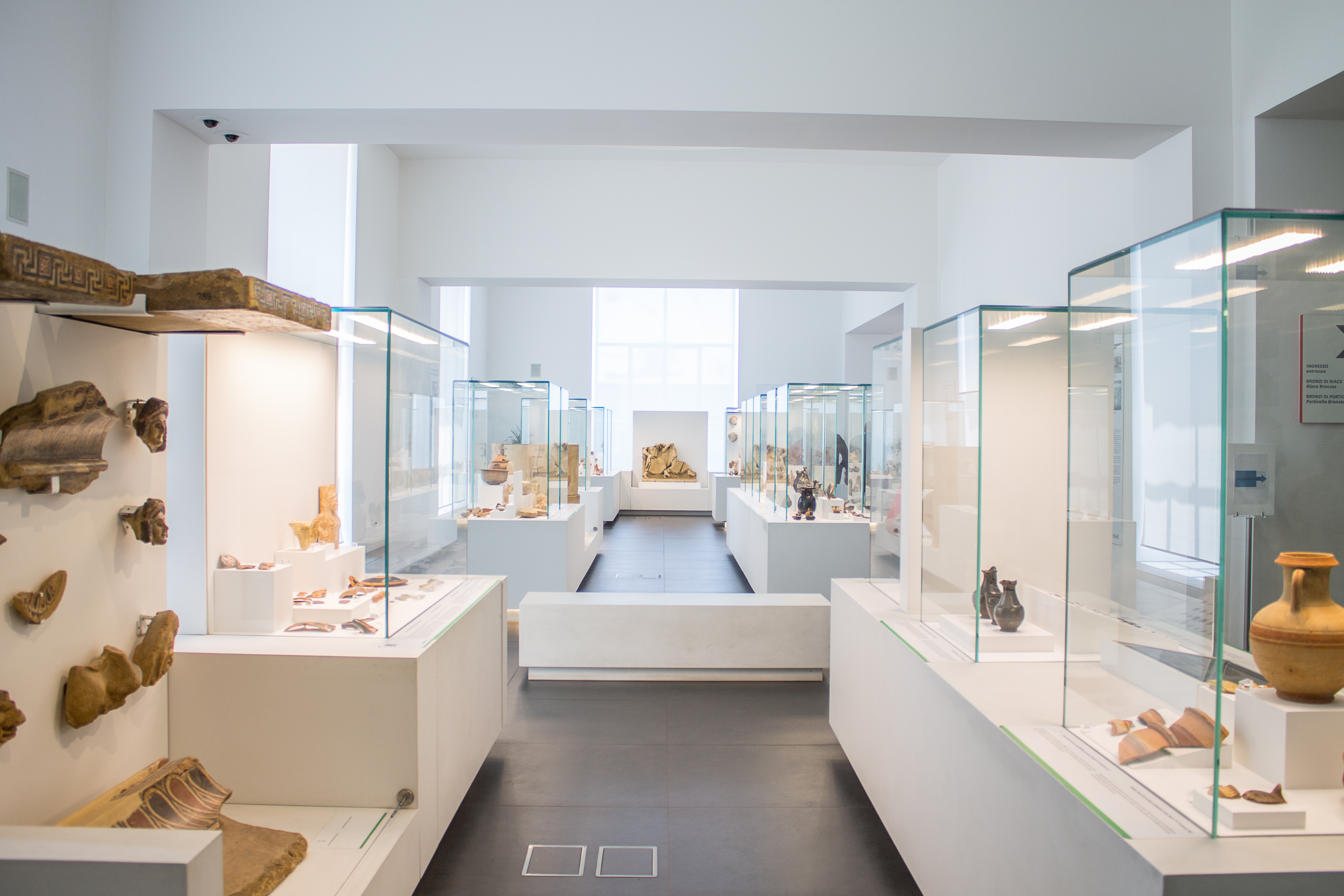 Il fil rouge di tutto il museo sono pareti e arredi dalla dominante bianca con dettagli in rosso cupo, cromie che lasciano risaltare ogni singolo reperto e amplificano la luce che per secoli a quei tesori è stata negata. Luce proveniente dal cortile interno coperto a vetri, dal quale è stata ricavata grande piazza dedicata a Paolo Orsi, archeologo che già ben noto in Sicilia, è tra i fondatori del nuovo Museo Nazionale Archeologico.