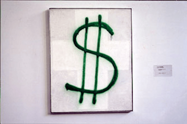 A riuscire a farsi riconoscere, purtroppo,è stato, invece, Alexander Brener: il suo imbrattare Suprematisme di Kazimir Malevich col simbolo del dollaro come il peggiore dei graffitari, lo ha addirittura fatto applaudire da alcuni critici russi annoverandolo tra i membri dell’azionismo russo. “Ho crocifisso il dollaro come Gesù” disse indicando la croce bianca che faceva ormai da sfondo alla vernice verde. Si beccò 10.000 dollari di multa, ma poi continuò la sua carriera come rinomato gallerista.
