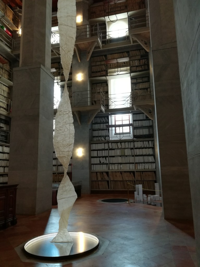 Avvitandosi su se stessa un’elica grezza scende dall’alto soffitto per appoggiarsi su di un piano riflettente lasciando trasparire i suoi naturali spessori alla luce naturale. Questa è la memoria, fatta di carta, custode dei documenti che attestano le nostre origini, e che prende la forma del DNA, caratteristica identitaria per eccellenza. Attraverso materiali che ricordano l’arte povera di Pistoletto e Merz, ogni istallazione trasmette un altissimo valore concettuale.