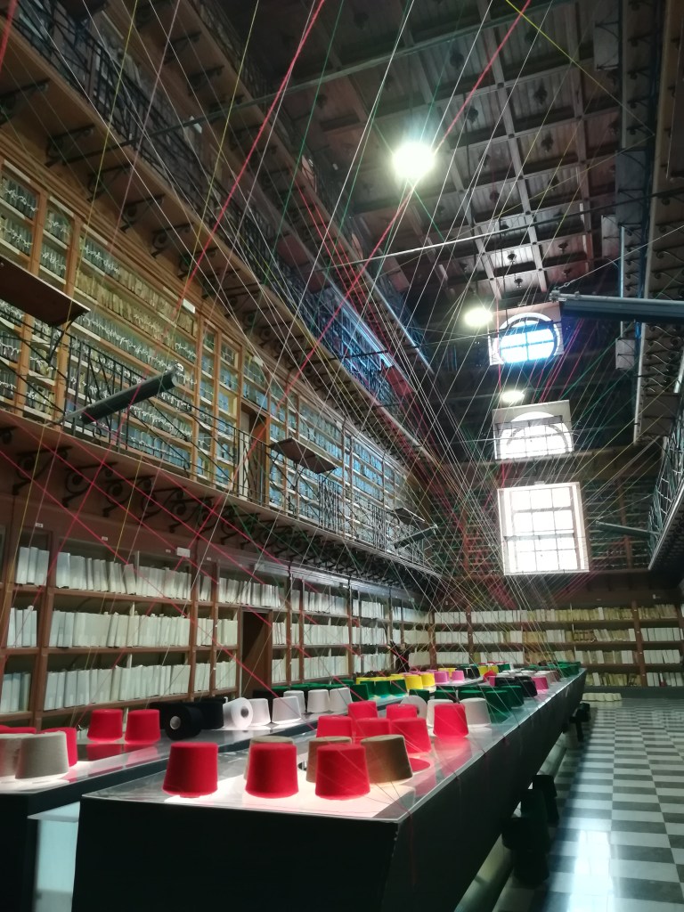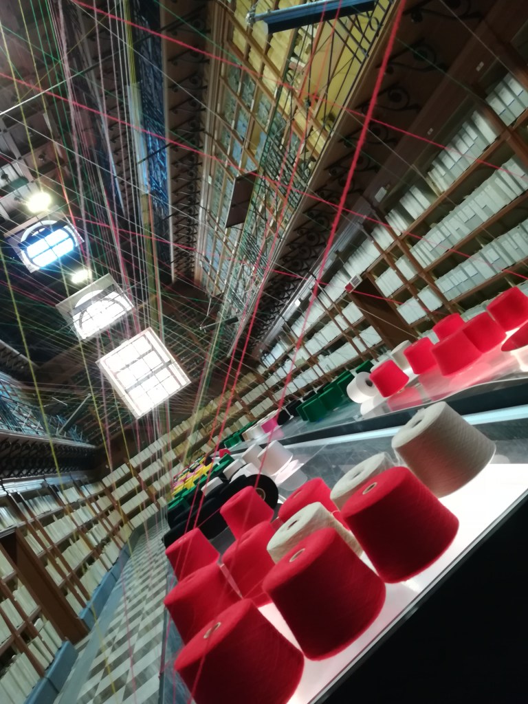 Alla sala successiva si accede per uno stretto e lungo varco incastonato tra gli scaffali, Memorie connesse la abita in ogni centimetro cubo, nel senso dell’ampiezza e dell’altezza. Immaginate l’intero perimetro siciliano tradotto in fibra tessile, 1152km di filo, in parte ancora avvolto nei suoi rocchetti ed il resto intrecciato tra le mensole custodi di antiche documentazioni ed il tavolo da lettura in cui, potersi ancora riflettere e trovarsi coinvolti da questo ordinato intreccio. Si gioca con memoria e radici, scegliendo un materiale, il filo il cui nome in greco antico evoca il verbo dell’amare e l’azione dell’unire. Materiale non infallibile ma che racchiude, unisce e lega. A colmare lo spazio non occupato dalla rete di filati, delle voci registrate raccontano, come in un intervista, la soggettiva definizione di vuoto di chi la Sicilia la abita e di chi ne è venuto a contatto. Attraverso il suono si occupa così anche lo spazio che i legami variopinti non hanno colmato. E così, la memoria, colma il vuoto.