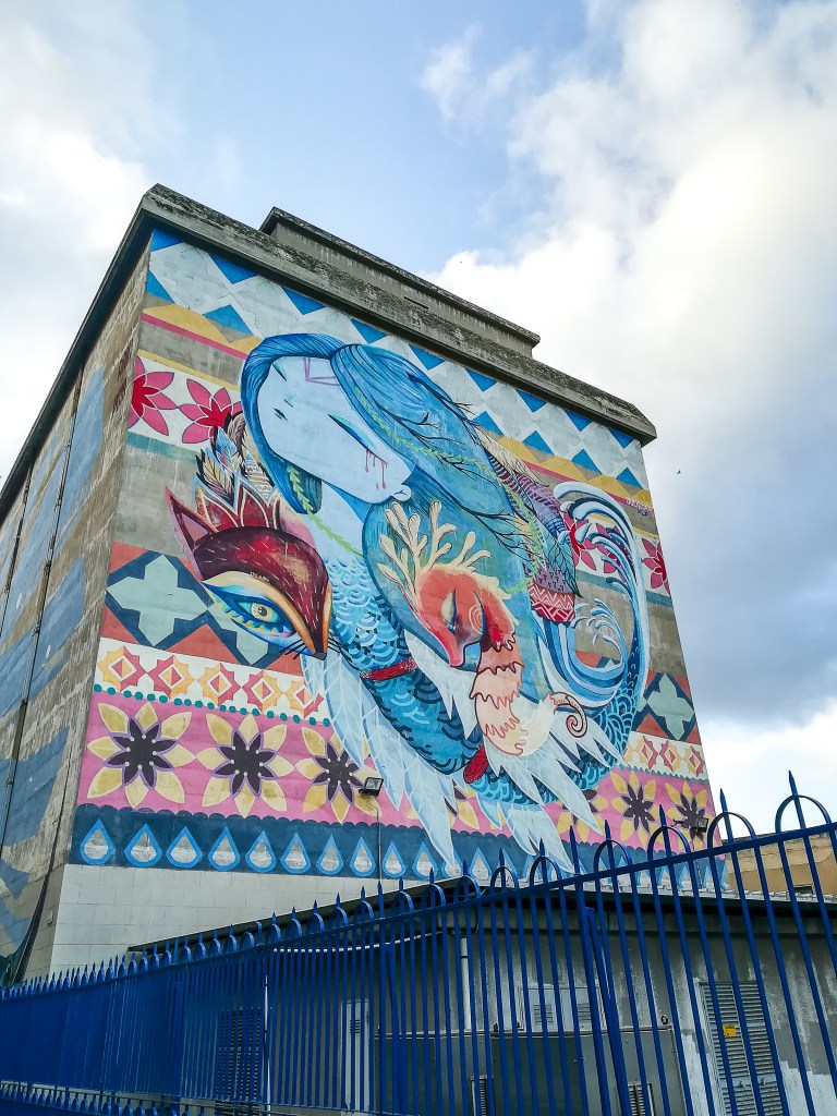 Girando l’angolo, sulla facciata che dà su Piazza Stazione, a dare il benvenuto ai viaggiatori è Julieta xlf con la sua sirena, un po’ manga e un po’cartoon, riprende stilemi pop ma si fa foriera di messaggi di solidarietà. Affiancata da un cavalluccio marino e da una volpe, con coralli intrecciati nella sua chioma, sull’azzurro della sua carnagione spiccano delle lacrime rosse, simbolo del sangue delle vittime dell’immigrazione per mare. Lo sfondo riprede i motivi delle ceramiche tradizionali in chiave pop.