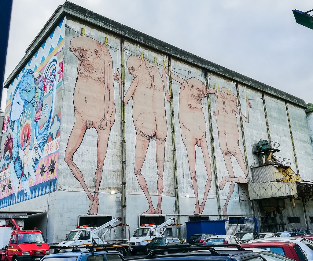 Lo stesso tema sullo stesso edificio è affrontato da NemO’s. Le sue figure umanoidi rugose e sempre nude qui sono appese ad un filo da bucato ad asciugare al sole, come fradice dopo un naufragio. Ed è proprio per riportare alla memoria un incidente simile (di quelli ancora troppo frequenti) che realizza questa opera colossale: l’annegamento dell’atleta somala Saamiya Yusuf Omar, fuggita dal suo paese su di uno dei barconi della morte il 2 aprile 2012. Finissimo l’espediente tecnico di lasciare che ognuna delle figure appoggi i piedi sull’architrave delle finestre al piano terra o col ginocchio sulla pensilina.