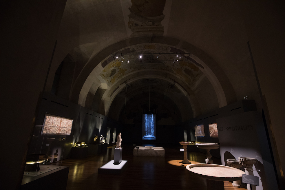 E’ allestita nella Sala Duca di Montalto, ambienti sotterranei restituiti alla fruizione nel 2018, situata proprio sopra agli scavi che di recente hanno riportato alla luce impianto murario punico di circa 2500 anni fa. L’ampia Sala, originariamente destinata a deposito di munizioni, nel tempo fu trasformata in locale per le udienze estive del Parlamento e infine in stalle durante la dominazione borbonica (e si perché i Borbone ci tenevano che i loro cavalli si godessero gli affreschi meravigliosi del soffitto, mannaggia a loro!). Un grande ambiente in penombra raggiungibile scendendo una rampa di scale, che per l’occasione è stata animata da una proiezione di video mapping che simula sui gradini una cascata, anticipazione del tema portante della mostra.